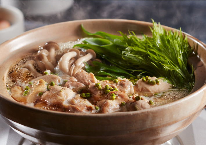 地鶏丹波黒どりの歯ごたえと旨み、朝倉山椒のピリリとした刺激、爽やかな香りを存分に楽しめます。風味豊かな京風出汁がベースのつゆと地鶏丹波黒どりのクリアスープで、美味しさも段違い。お好みの野菜とともに、余すところなく味わってください。